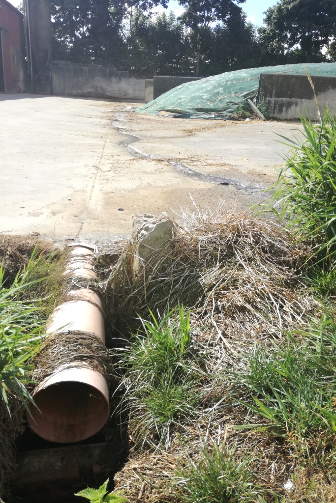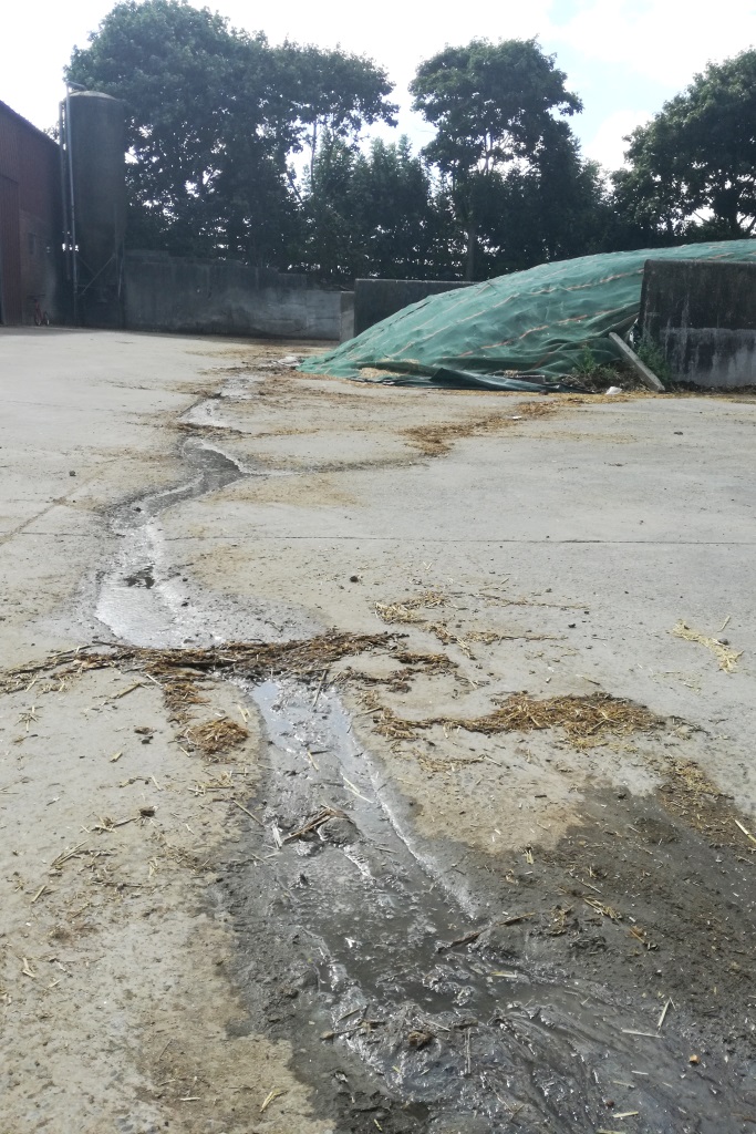 Zo wordt het water in bochten geleid en kan het beter door de planten gezuiverd worden. Dit systeem werkt volgens het first flush-principe: bij droog weer vloeit er maar een klein straaltje sap af. Dit loopt meteen langs de opvangbuis naar beneden, de mestkelder in. Het is pas wanneer de regen zorgt voor veel afvloeiing dat het water met erfsappen doorstroomt naar het rietveld. Carl schat dat dit jaarlijks neerkomt op zo’n 800 kubieke meter erfsappen die in het rietveld terecht komt. Het spoelwater van de twee maal twaalf melkinstallatie is niet geschikt voor afvloeiing naar het rietveld. De zuurtegraad is niet ideaal voor de bacteriën in het rietveld. Het spoelwater van de melkinstallatie loopt hier in de mestput.