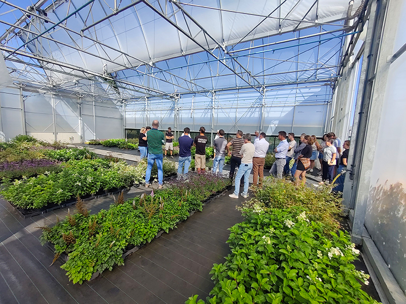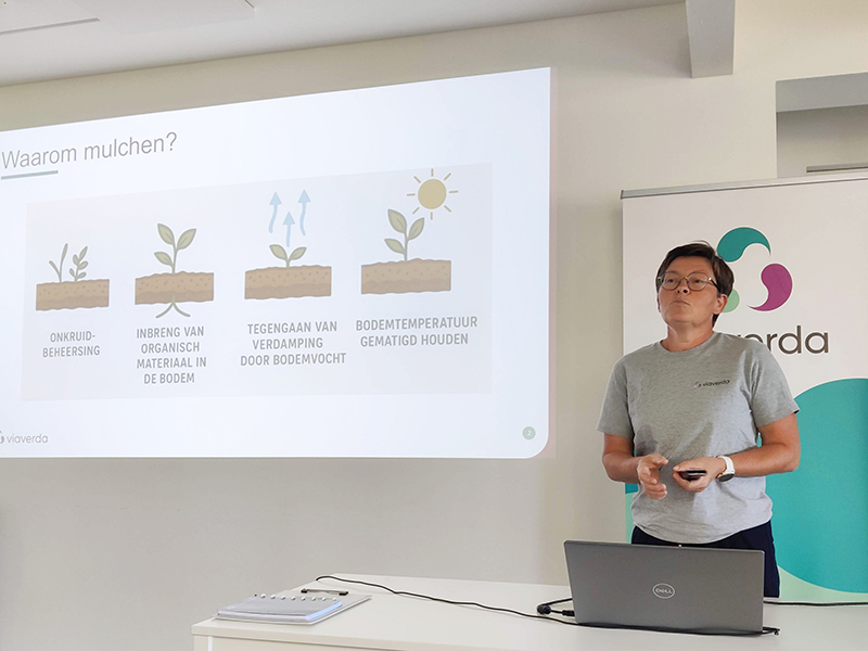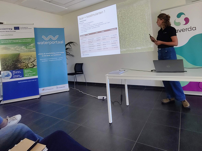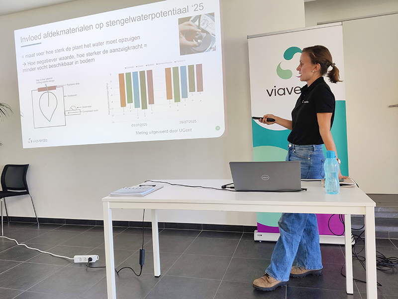 Tot slot worden wetting agents op Viaverda niet alleen in vollegrond maar ook in containerteelten uitgetest. In de cabrioserre presenteerde Marijke Dierickx de tussentijdse resultaten van deze producten en legde ze de link met het Waterportaal: een infoloket waar land- en tuinbouwers terechtkunnen voor advies rond waterbeheer op hun bedrijf.
