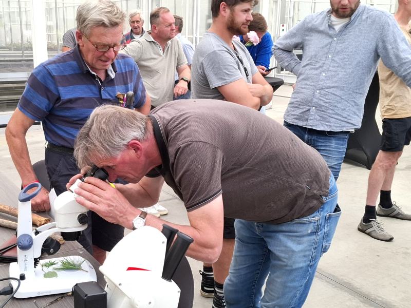 Teamleiders Dominique Van Haecke en Marijke Dierickx namen ruim de tijd om in gesprek te gaan met telers. Siertelers en groenvoorzieners werden in drie groepen verdeeld om de verschillende rondgangen te maken. De gevolgen van plagen en ziektes zie je nog het best door in een microscoop te kijken en te analyseren.