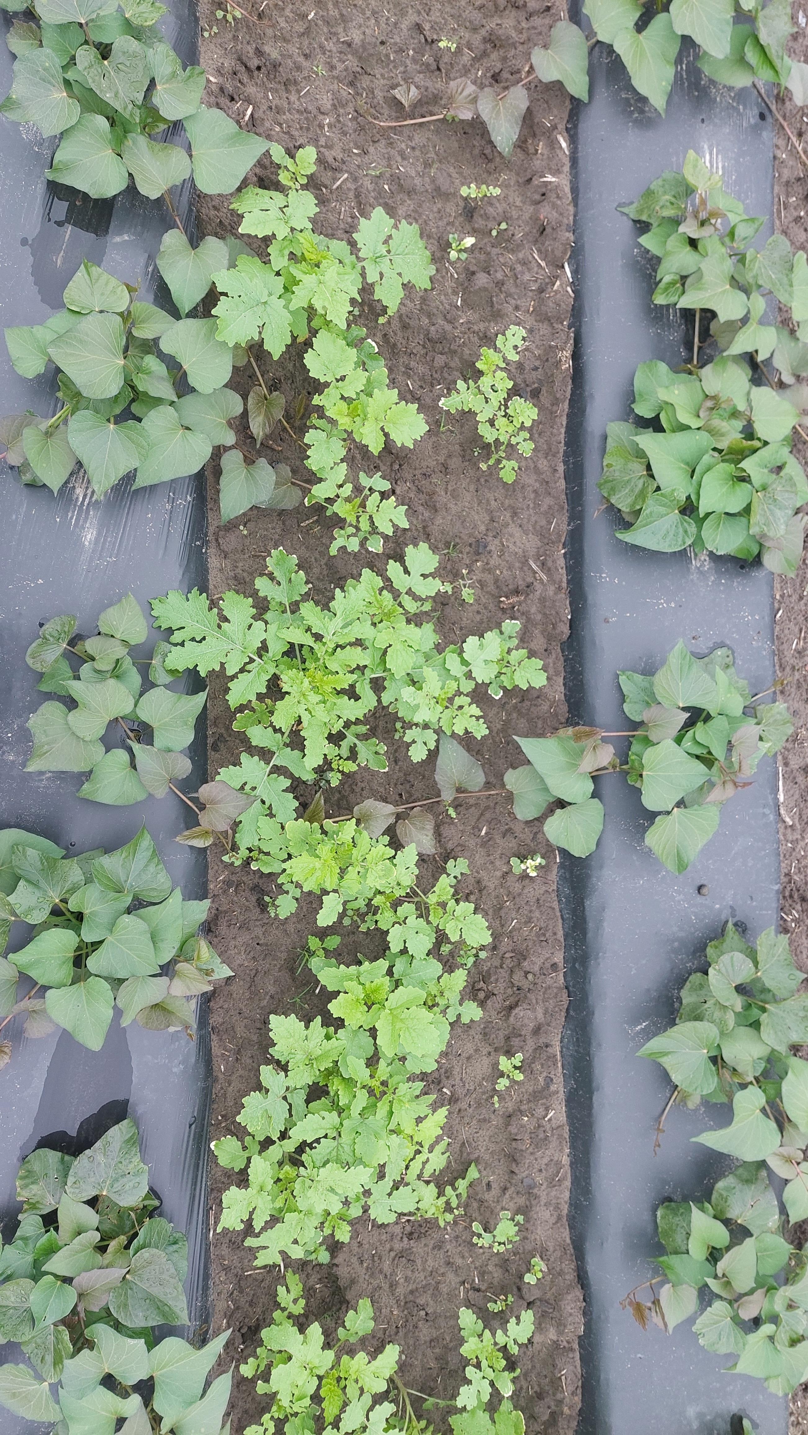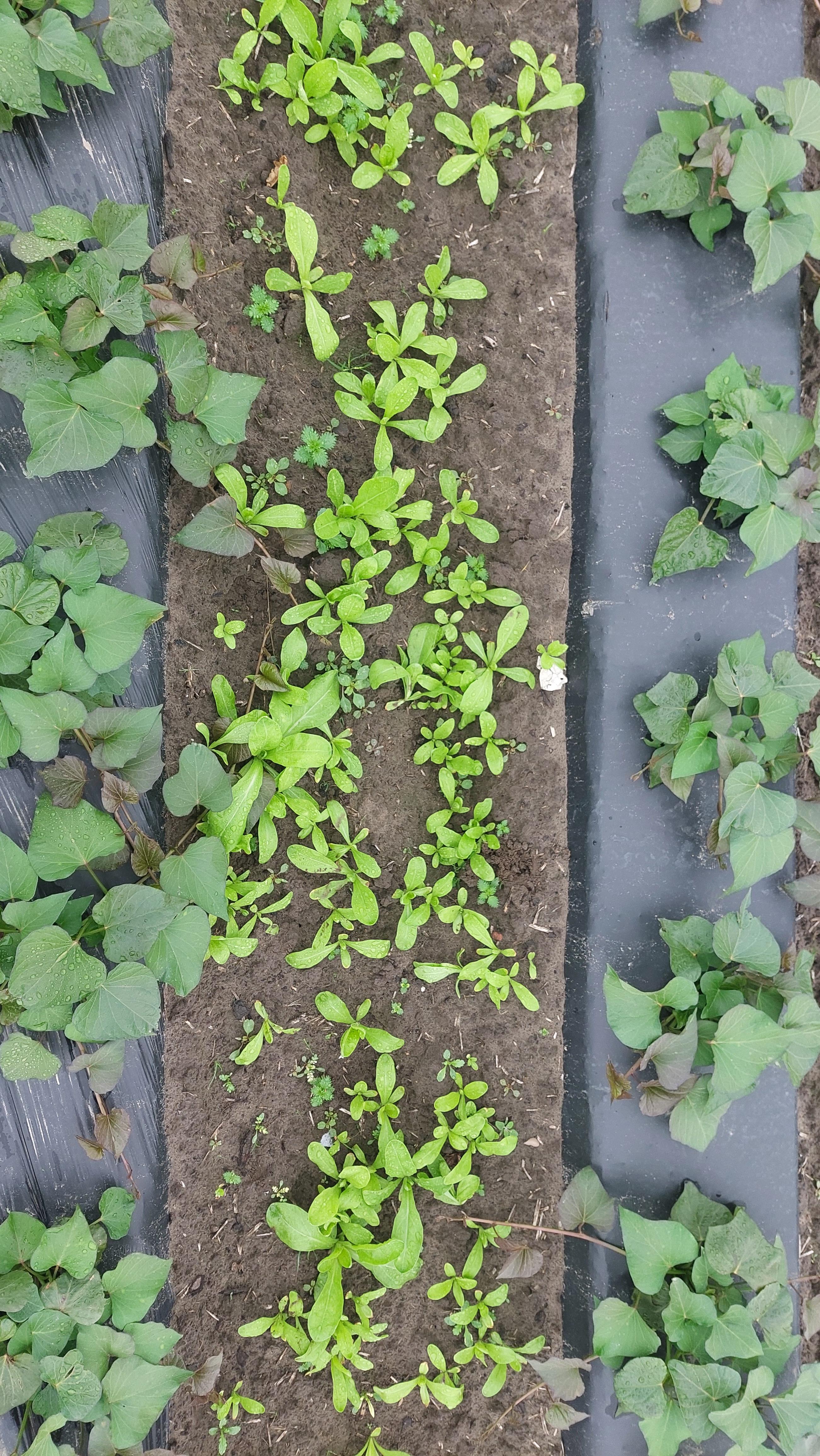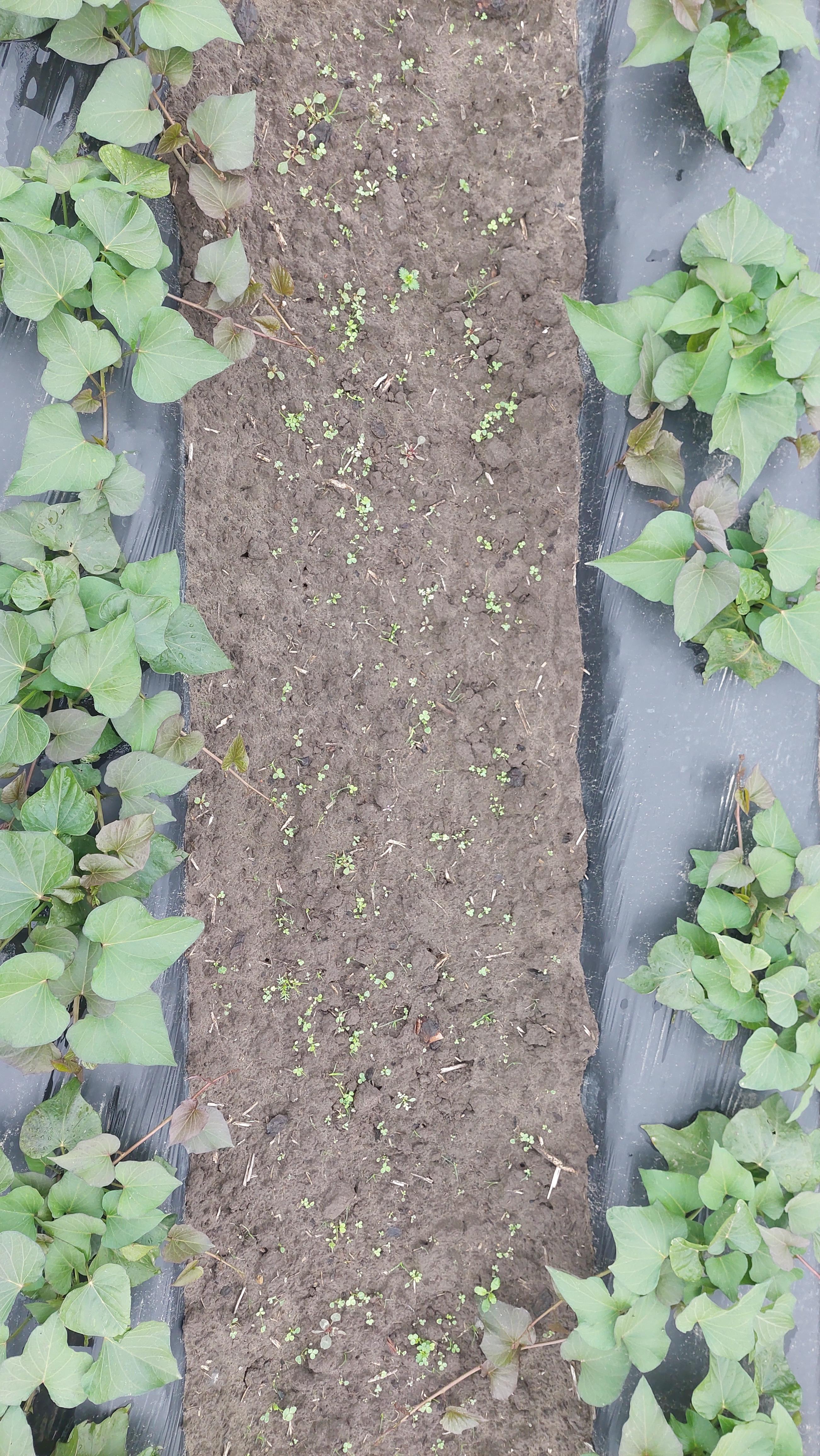 Op vraag van de sector werd dit seizoen een kleine demoproef aangelegd om het potentieel van tussenzaai tussen de folieruggen van bataat te bekijken.