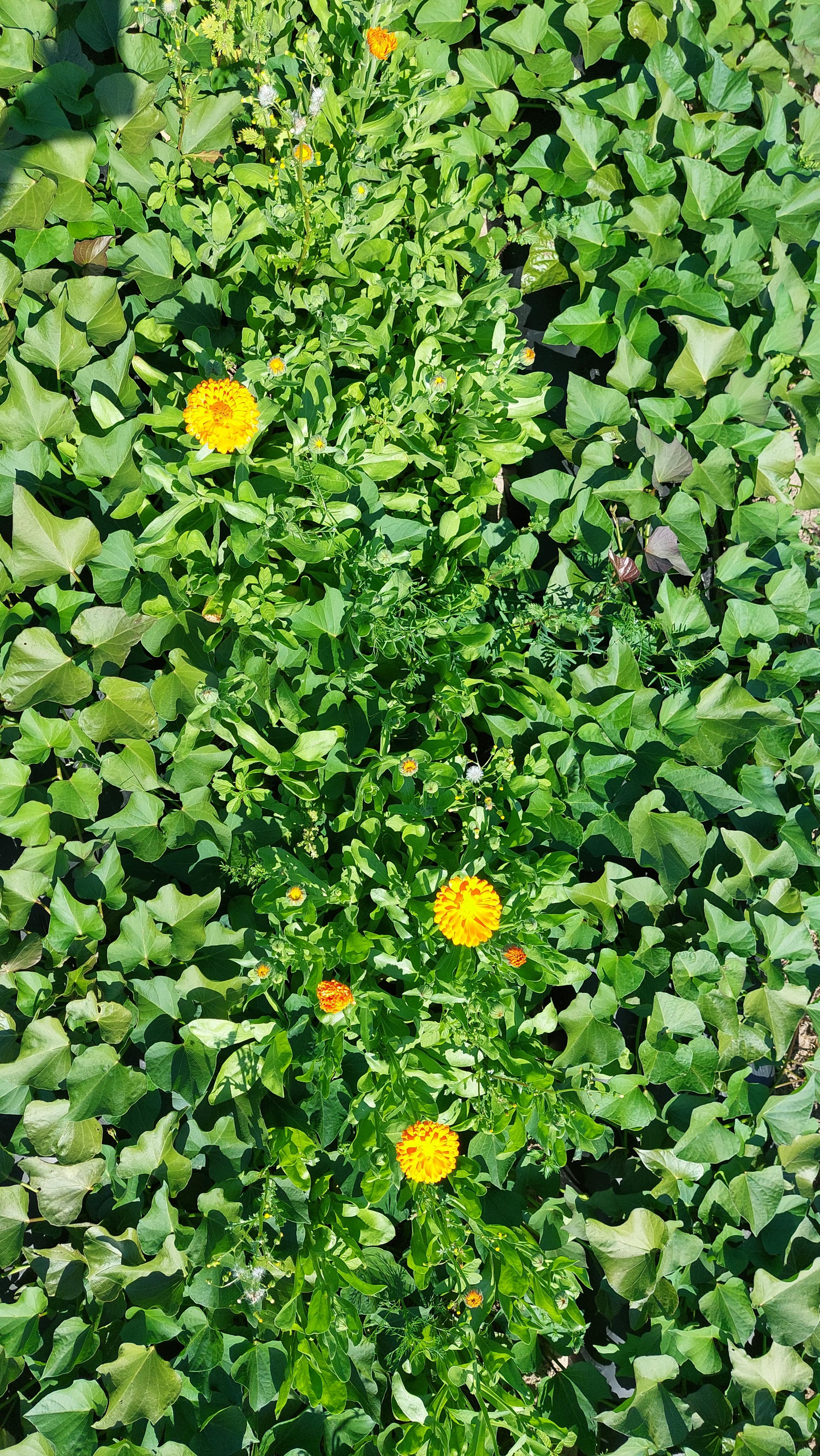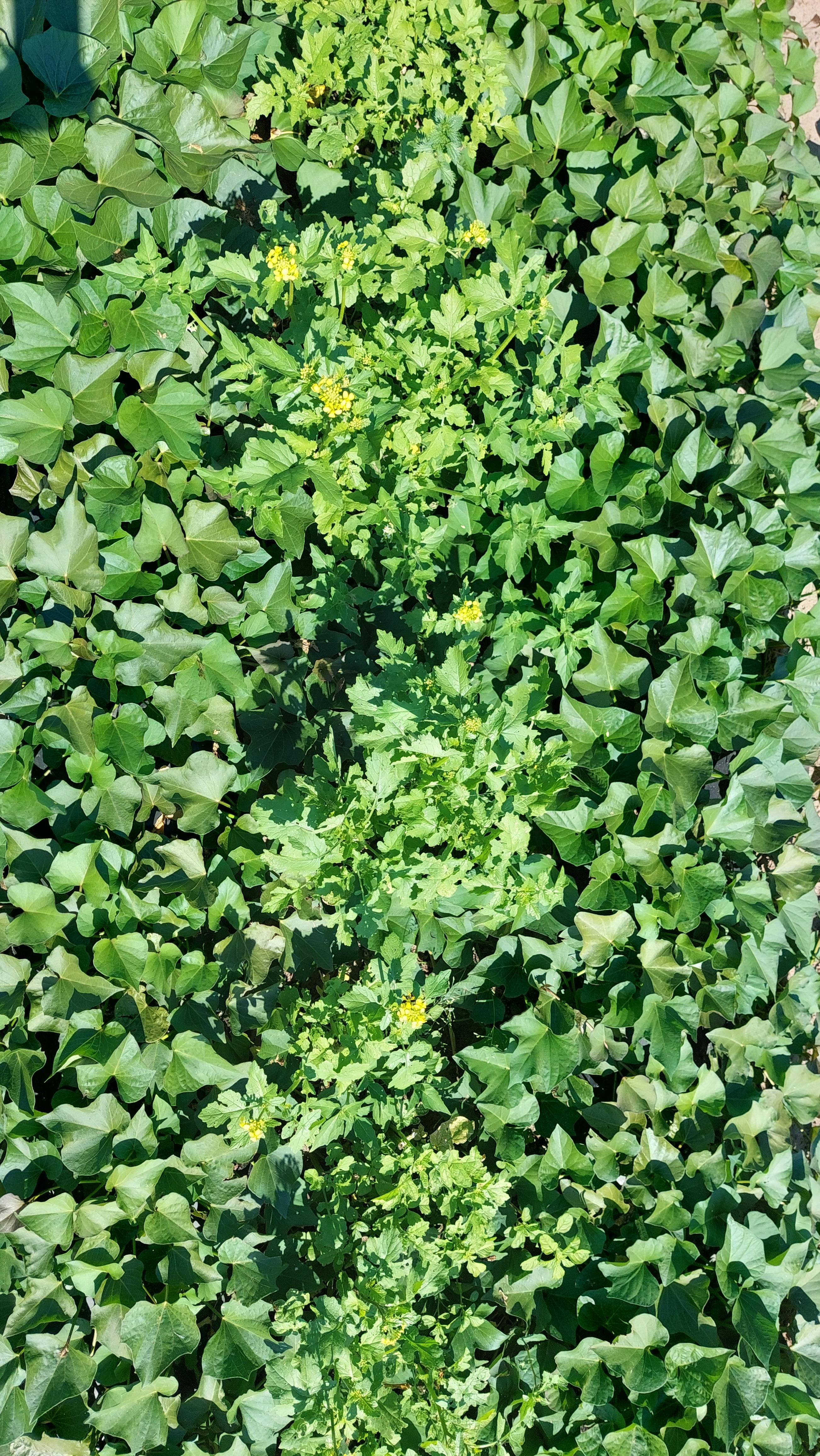 Op de foto’s hieronder kan je de gewasstand zien op 2 juli (links) en 29 juli (rechts). De gele mosterd kwam het snelst op, gevolgd door de goudsbloem en duidelijk trager de witte klaver. Omwille van het manuele inzaaien was de verdeling en opkomst van de groenbedekker niet overal even uniform. De gele mosterd werd 1 maal teruggesnoeid boven het gewas van de bataat om te felle groei tegen te gaan.